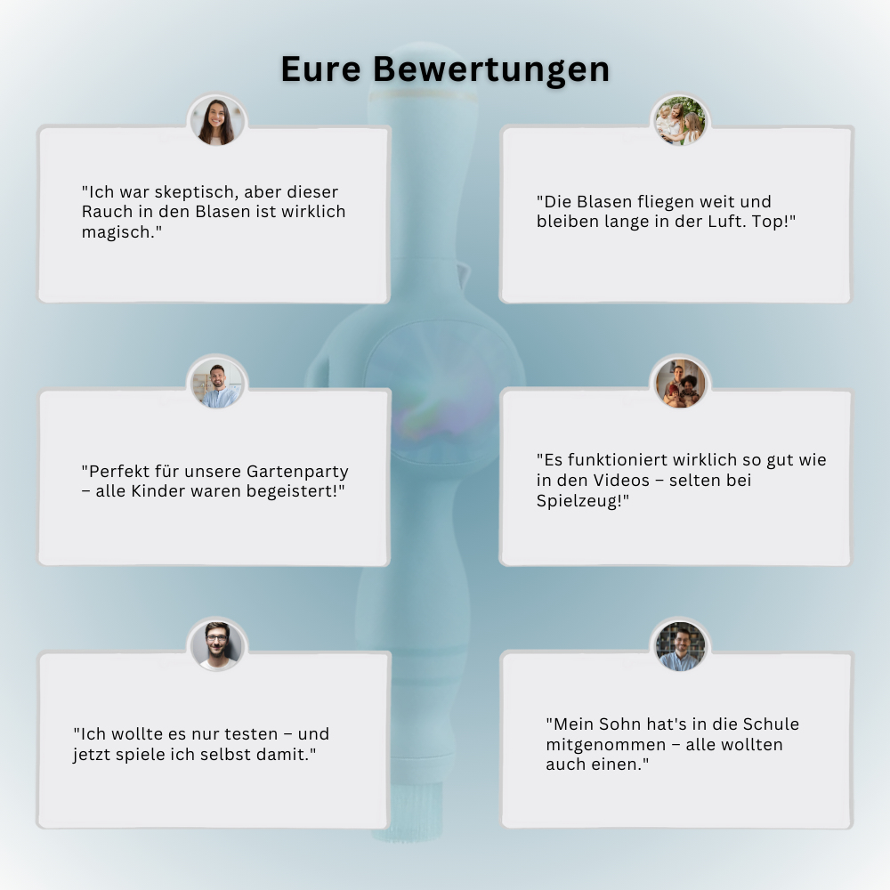 Während andere Bubble Guns nach 10 Minuten in der Ecke liegen, erzeugt der Bubble Blaster immer wieder Staunen. Eltern berichten von stundenlanger Beschäftigung, Lachen – und sogar beruhigender Wirkung durch das Beobachten der Rauchblasen.